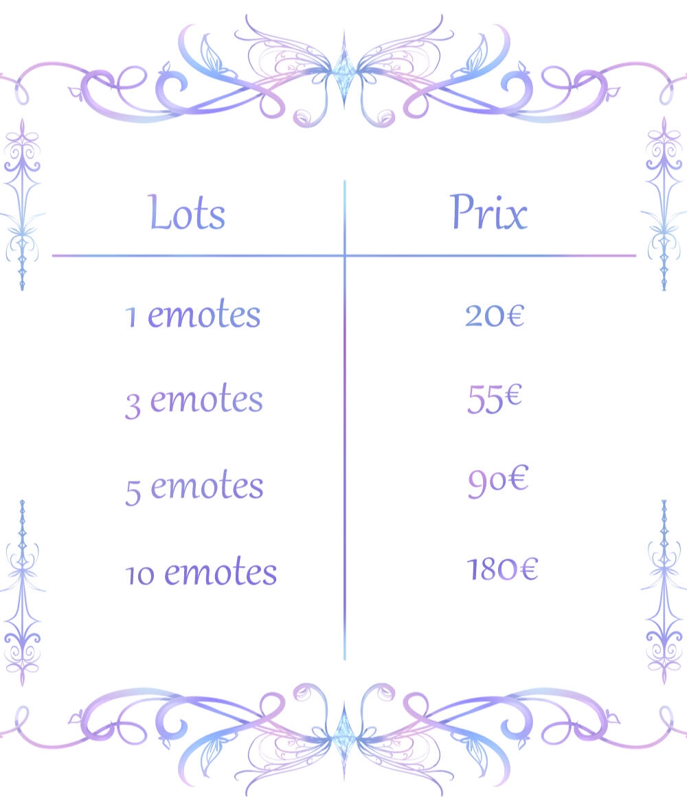 Vous choisissez l'emote que vous souhaitez avec les modèles montrez ci-dessous. Il sera personnalisé selon votre avatar.